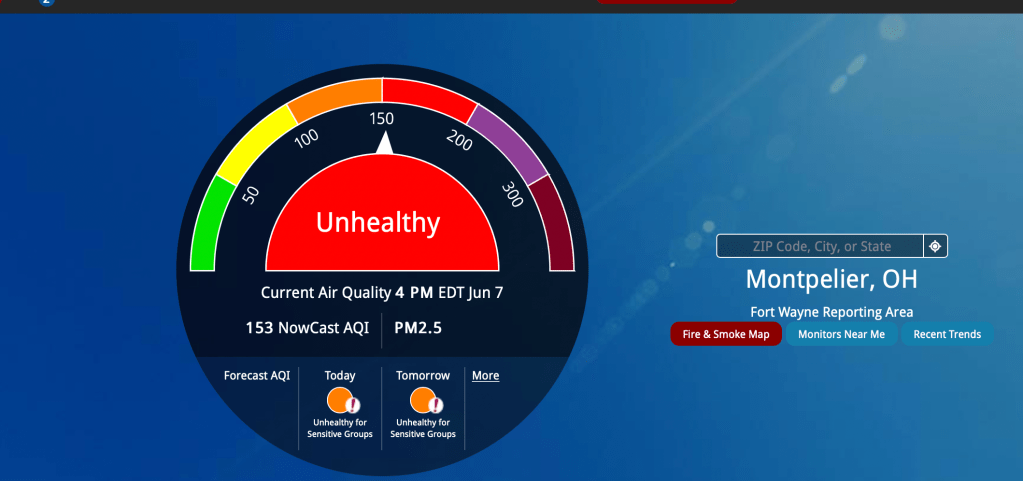 Smoke from fires in Canada and parts of northeastern U.S. is spreading south over much of the Midwest, Ohio Valley, Northeast and Mid-Atlantic, bringing milky-white skies and dangerous air pollution to the most populous corridor of the country. Fine particles contained within the smoke, hazardous to breathe, have prompted air quality alerts for tens of millions of people. With my lungs chugging along at 21% of capacity I’m one of the people those alerts are aimed at. It has NOT been fun.