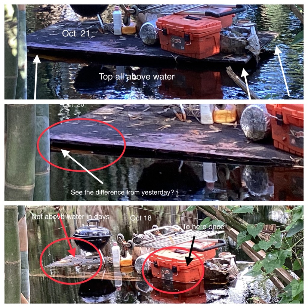 When Hurricane Ian dumped nearly two feet of rain on us here in The Swamp in DeBary, FL we’ve been seriously flooded out. Alligators have been swimming where I’d normally be parking my SUV. Flood stage for the Saint Johns River, where I’m moored, is four feet at Astor, about 30 miles north of me. In Deland, the next town to my north the water stage stands at 6’2″! The sayers at the U.S. Weather Service sooth that the river is expected to fall to four and a half feet by this coming Thursday, October 27th. Still an awfully long way to go.