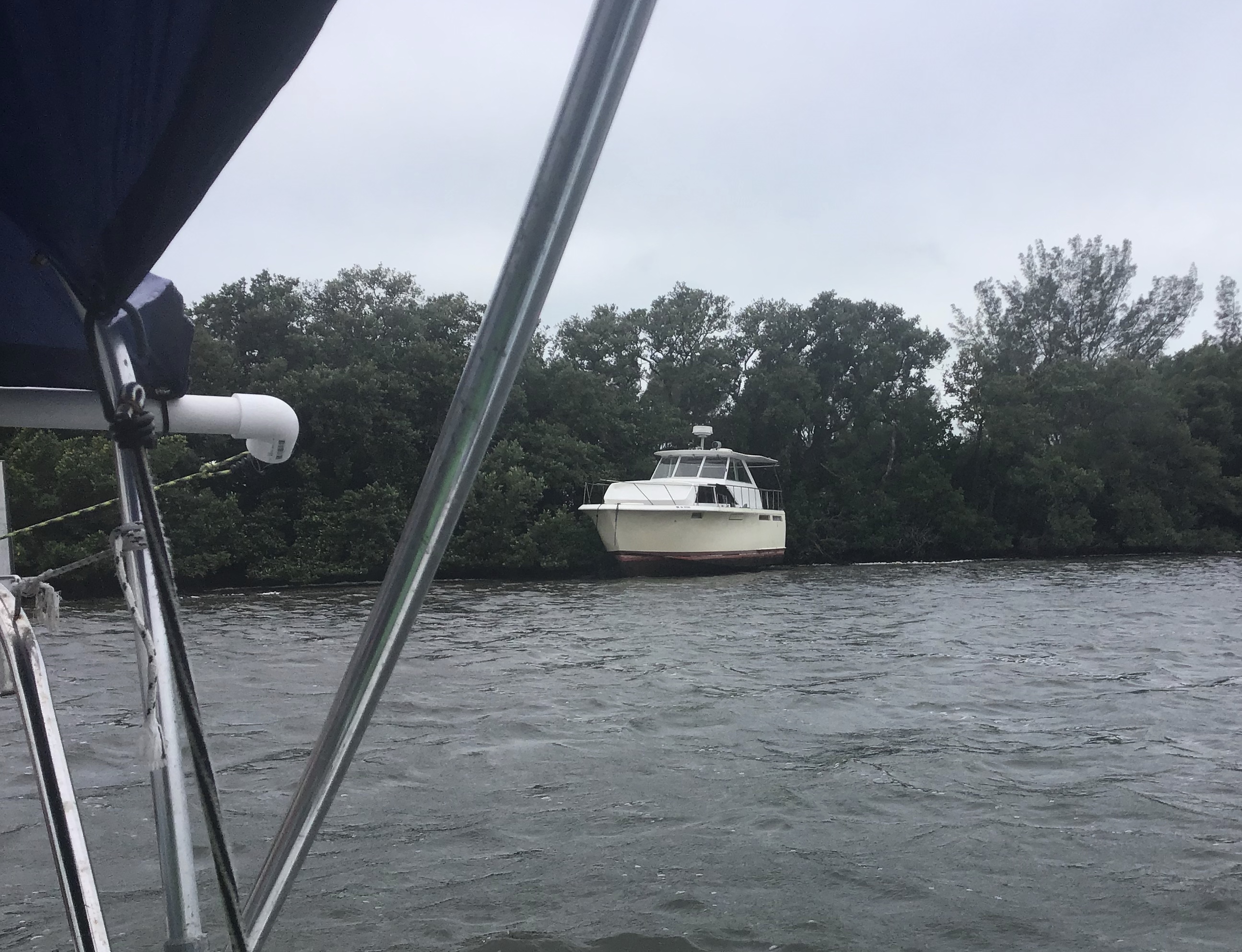 My biggest concern was for the semi-derelict, engineless power boat to windward. It has been dragging anchor for the last couple of months and worries me when I’m in its path downwind. The couple that supposedly own the boat, I call them “Itchy and Scratchy” are only aboard occasionally and were not there to help if things went belly up. I keep a large, very sharp knife in the cockpit so I can cut its anchor line if it drifts down on me. I turned on my mobile “hotspot” and checked “Willy Weather” for tide data. It was at half tide and falling. So, for the next five or six hours, with my 1-foot draft, I would be in water too shallow for the big boat’s draft to handle and by then the wind might have abated somewhat.